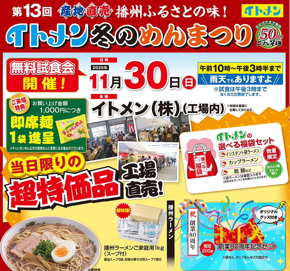 イトメンニュース ITOMEN News 第13回イトメン冬のめんまつりのご案内 第13回イトメン冬のめんまつりを開催いたします。 イベント開催日 2025年 11月30日(日)AM10時~PM3時半まで(試食は3時まで) 播州らーめん試食と即売会を行います。 一覧に戻る