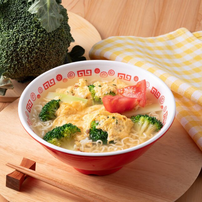 2,500㎖の湯を沸騰させ、めんと付属のかやくを入れて3分煮て「1」のブロッコリーと粉末スープを加える。ひと煮立ちしたら溶き卵を回し入れて火を止める。